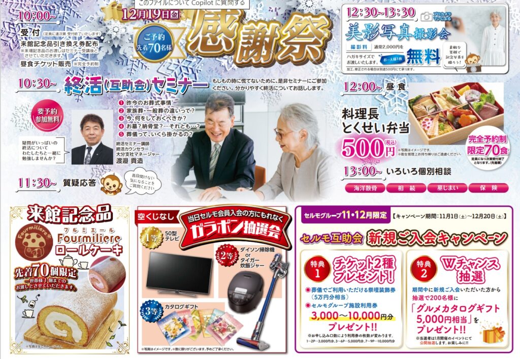 【特別企画②】 ①チケット2種プレゼント・葬儀で利用できる祭壇装飾件5万円分相当 ②Wチャンス抽選(12月限定)