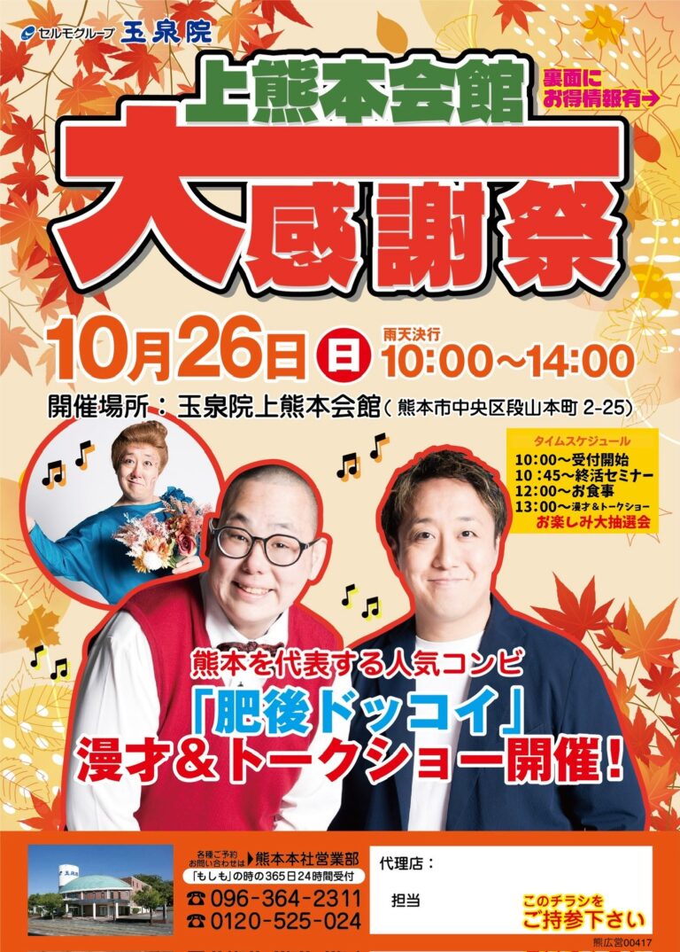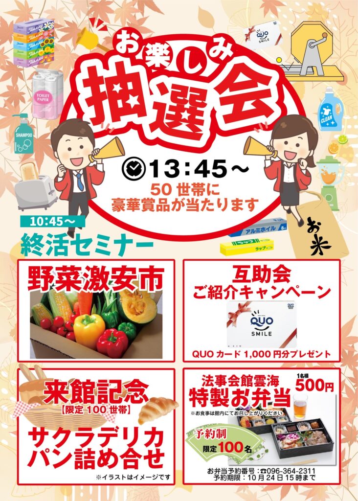 【日程】10月26日(日) 【場所】玉泉院 上熊本会館 【時間】 10:00 受付開始 10:45 終活セミナー 12:00 お食事 法事会館雲海特製お弁当1名様500円 ≪要予約≫10月24日15時まで100名様限定 13:00 漫才&トークショー 熊本人気コンビ『肥後ドッコイ』登場! 13:45 お楽しみ抽選会 50世帯様に豪華賞品が当たります!
