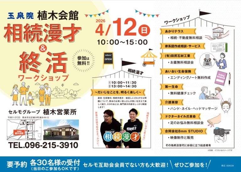 セルモグループ 玉泉院 植木会館では、「相続漫才&終活ワークショップ」を開催いたします。