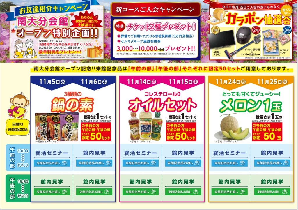 ▼日替わり来館記念品▼ ≪11月5・6日≫ ・3種類の鍋の素 (一世帯1セット、ご予約限定50セット) ≪11月14・15日≫ ・コレステロール0 オイルセット (一世帯1セット、ご予約限定50セット) ≪11月24・25日≫ ・とっても甘くてジューシー!メロン1玉(一世帯1セット、ご予約限定50セット) どれも日常の食卓にお役立ていただける商品を揃えました!
