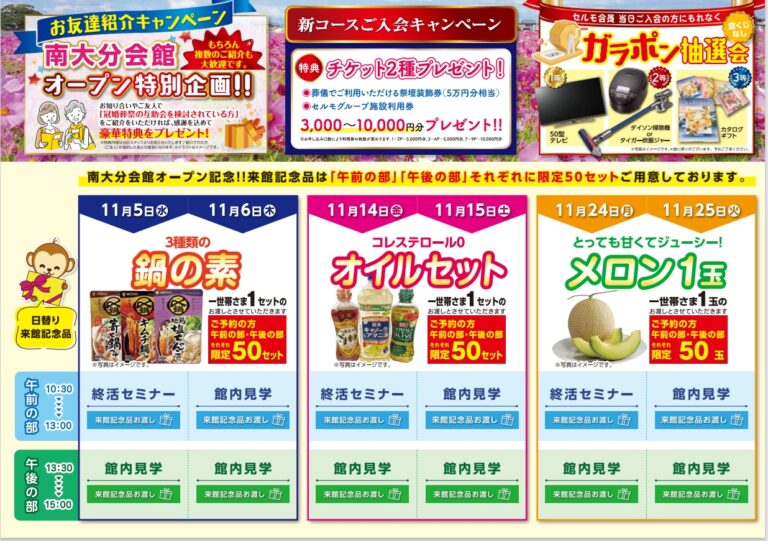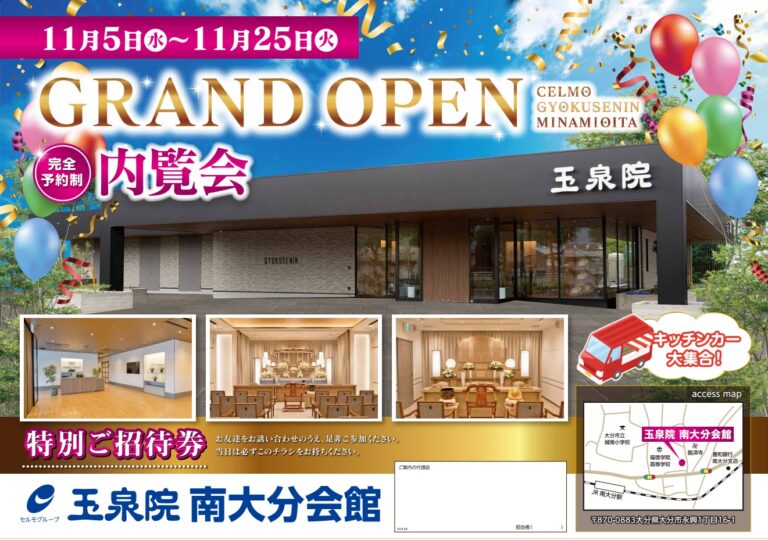 皆様こんにちは。 朝晩の冷え込みに、秋の深まりを感じる季節となりましたね。 さて、この度 玉泉院 南大分会館がリニューアルオープンいたしました! 今回の新会館は、新たにバリアフリー対応の平屋建てとして生まれ変わり、温もりを感じる色調のデザインで落ち着いた空間を演出しております。 特に今回はリニューアルオープンに伴い、特別なプレゼントもご用意いたしておりますので、スタッフ一押しのイベントです!
