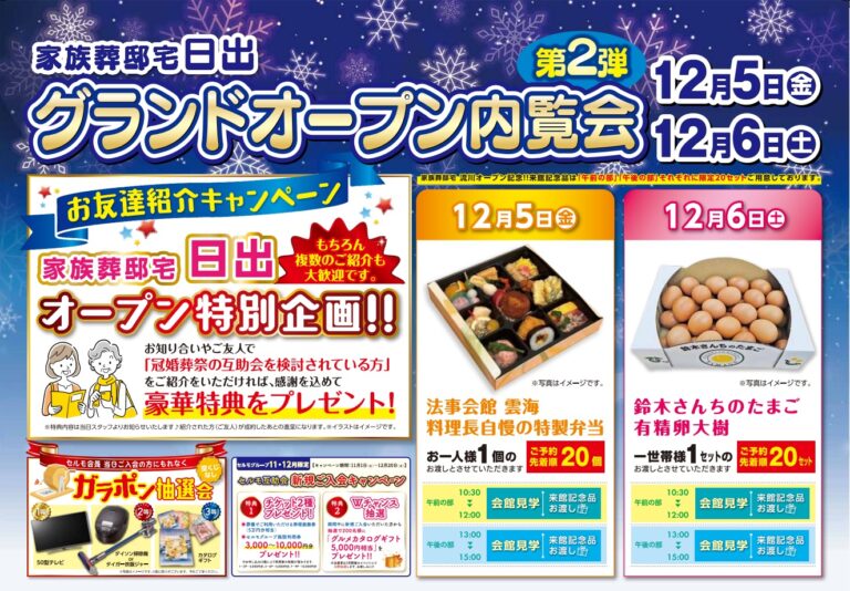 さて、12月にも 家族葬邸宅日出 グランドオープン内覧会 第二弾開催いたします。 【日程】12月5日(金)6日(土) 【場所】 玉泉院 家族葬邸宅日出 【時間】2部構成 ≪午前の部≫ 10:30~12:00 会館見学&来館記念品お渡し ≪午後の部≫ 13:00~15:00 館内見学&来館記念品お渡し のスケジュールとなっております。