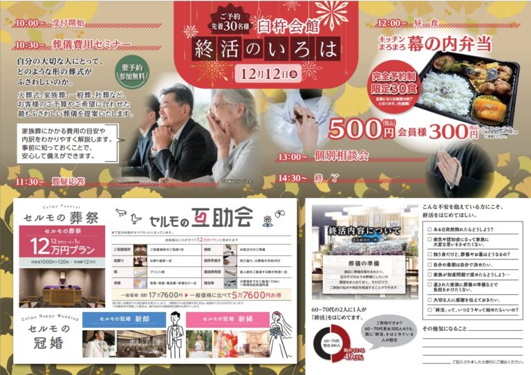 【日程】12月12日 10:30~『葬儀費用セミナー』 11:30~ 質疑応答 12:00~昼食 キッチンまろまろ:幕の内弁当 限定30食 (おひとり様500円 会員様300円) 13:00~ 個別相談会