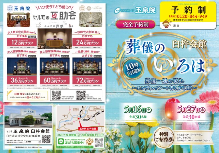 皆様こんにちは。 セルモ 玉泉院 臼杵会館では、 「葬儀のいろは 〜葬儀一連の流れ・エンディングノート書き方講座〜」を開催いたします。