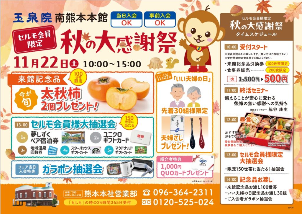 【日程】11月22日(土) 【場所】南熊本本館 【時間】 10:00~受付開始(来館記念品引換券100世帯限定)(食事券販売▶特別価格:500円) 11:00~終活セミナー『備えることが安心に変わる 後悔のない感謝への気持ち』 12:00~昼食 おもてなし弁当 13:00~セルモ会員様限定大抽選会(限定150世帯に当たる!) 14:00~記念品お渡し ご入会者ガラポン抽選会 15:00 終了予定