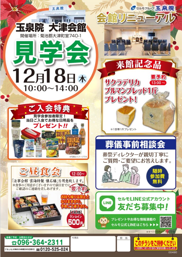 ▼当日特典 ①来館特典 13:00~ サクラデリカ 会 プルマンブレッド1斤 プレゼント! ※1世帯1斤要予約 ②ご昼食会 (12:00~)「法事会館 雲海特製 懐石膳」1名様500円 でご用意致します。 ※要予約(前日までに ご確認のご連絡を差しあげます。) ③ご入会特典 見学会参加者限定! 当日ご入会でお得な日用品を プレゼント!!