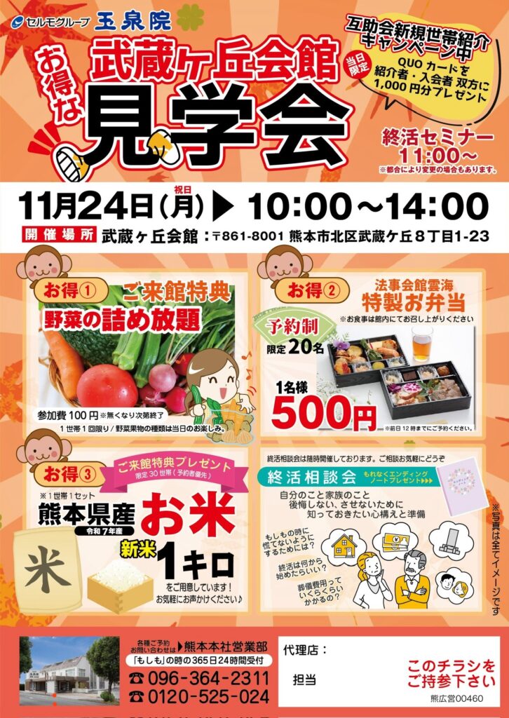 皆様 こんにちは。 さて玉泉院では、11月後半もさまざまなイベントを開催しております。 「終活」「事前相談」皆どのくらいなさっていますか? 見学会では実際に会館の雰囲気を感じながら、〈今のうちから始める〉ことができます。