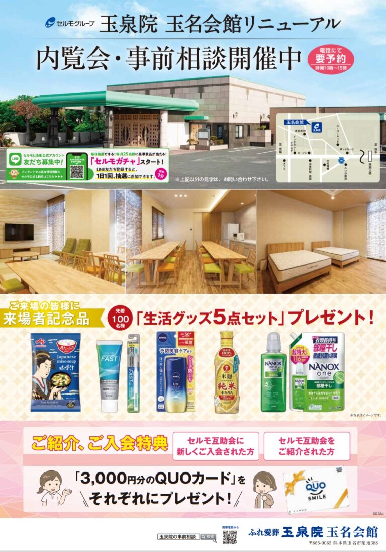 【日程】 10月4日(土)・10日(金)・16日(木)・26日(日) 【時間】 10:00~15:00 ※上記日時でご都合が合わない場合も、日時の調整を承りますので、どうぞお気軽にご相談ください 【場所】 玉泉院 玉名会館 【ご予約方法】 電話番号:0120-525-024