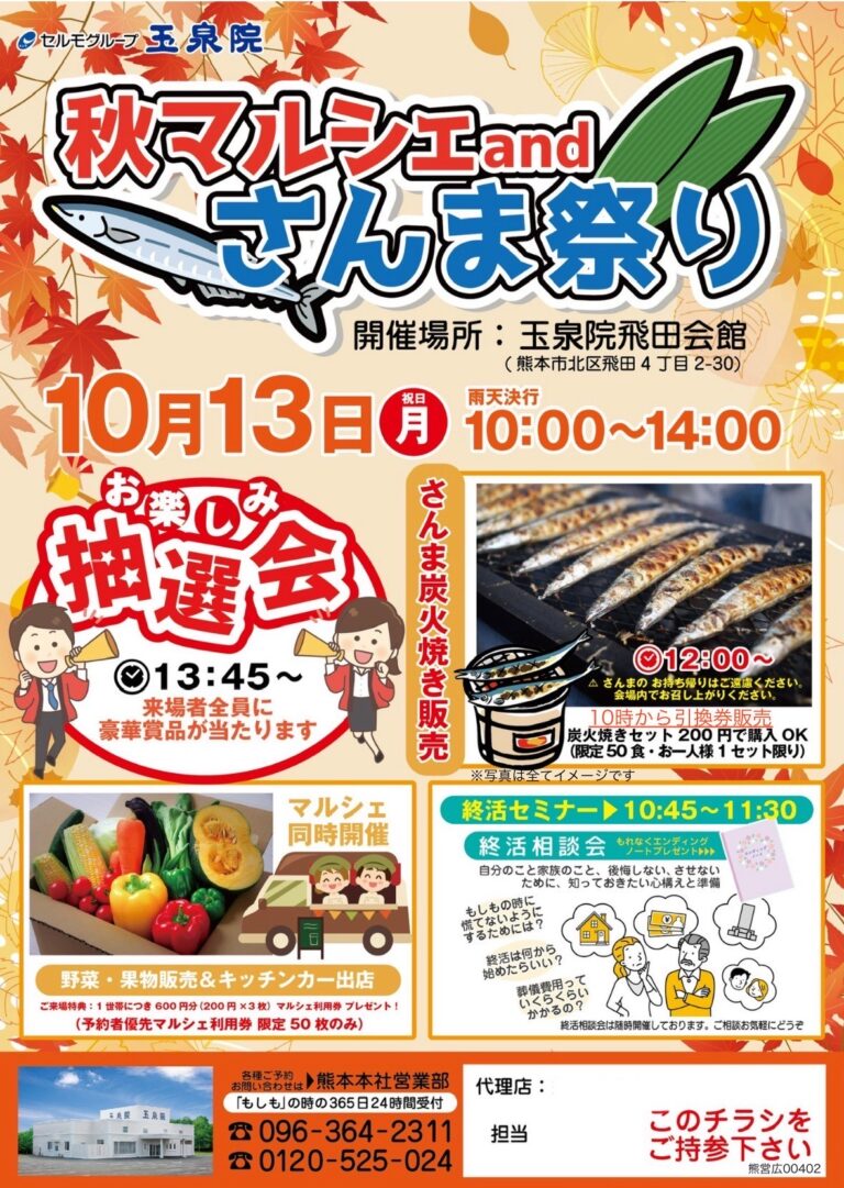 【日程】10月13日 【場所】玉泉院 飛田会館 【時間】 10:00 開始 10:45~11:30 終活セミナー終活相談会 エンディングノートプレゼント! 12:00~ さんま炭火焼き販売 限定50食 (10時~引換券販売200円) ※お持ち帰りはご遠慮ください。 13:45~ お楽しみ抽選会開催!