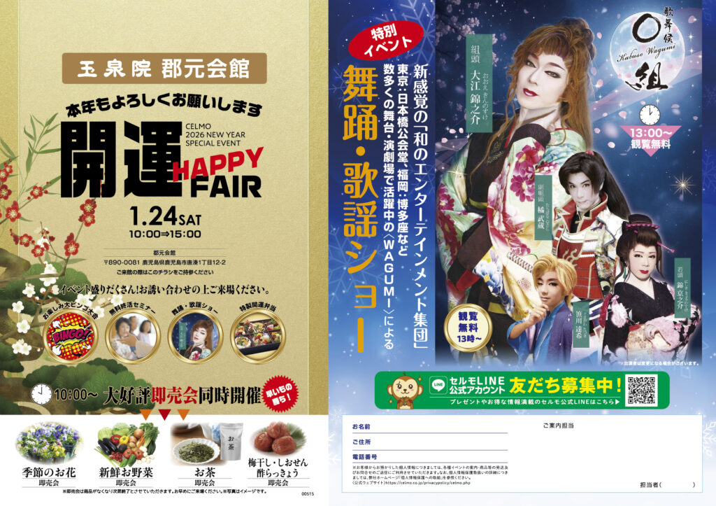▼開催日時 【日程】1月24日(土) 【場所】 玉泉院 郡元会館 【時間】10:00~15:00 【詳細】 10:00 受付開始・館内案内、見学会 10:30 大ビンゴ大会 11:00 冬の終活(互助会)セミナー開催 12:00 昼食・休憩 オリジナル特製開運弁当500円 13:00 特別イベント:WAGUMI舞踊・歌謡ショー 15:00 来場記念品お渡し