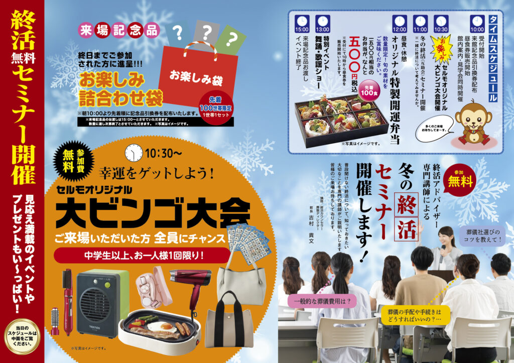 ▼当日特典 ①来場記念品 お楽しみ詰合せ袋 先着100名様限定 ②セルモオリジナル!! 大ビンゴ大会開催