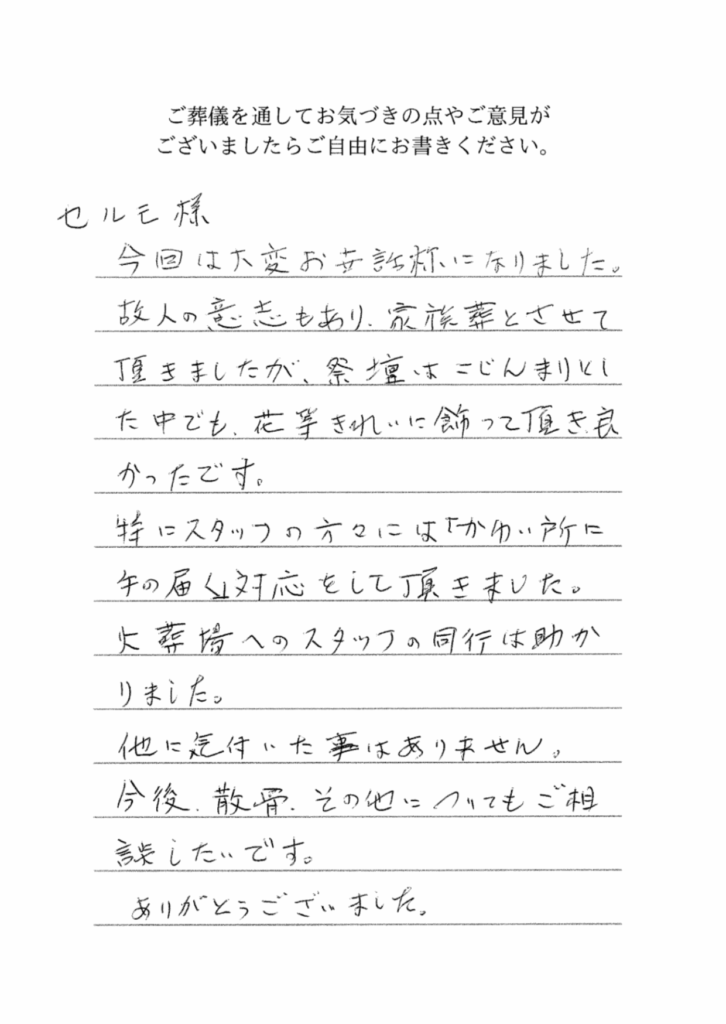 このたびは玉泉院にて家族葬をお任せいただき、誠にありがとうございました。 スタッフ対応や祭壇、お花につきましても温かいお言葉を賜り、大変光栄に存じます。 また、「手の届く対応」とご評価いただき、大切なお別れのお時間をお支えできましたこと、スタッフ一同の励みとなっております。 これからもご家族の想いを大切にし、安心してお任せいただける葬儀会館を目指してまいります。