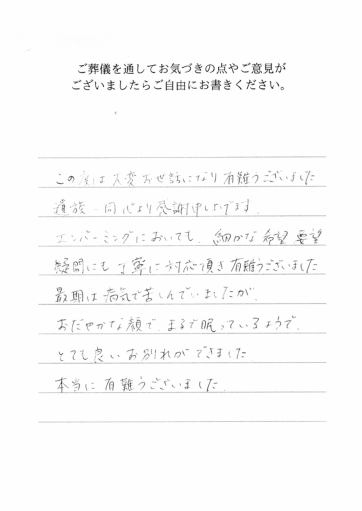 スタッフの対応につきまして、温かいお言葉を賜り、最期のお時間をお支えできましたこと、大変光栄に存じます。