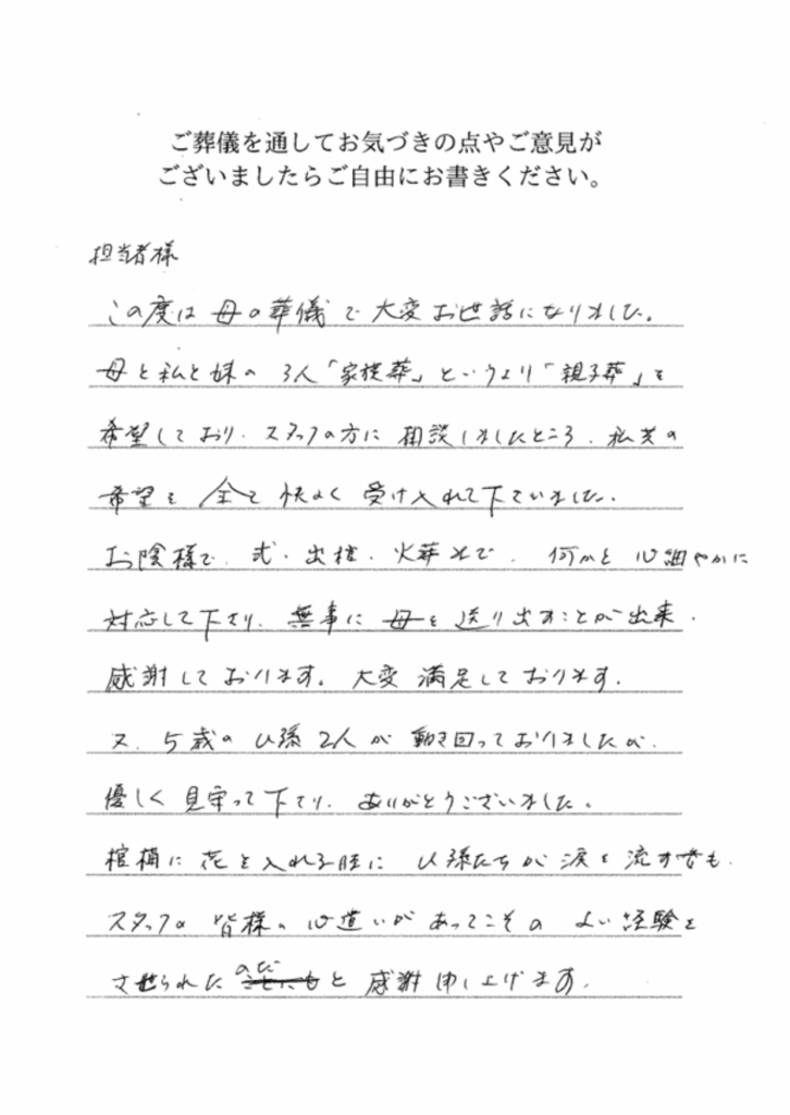 このたびはお母様のご葬儀を玉泉院にお任せいただき、誠にありがとうございました。 スタッフの対応につきまして温かいお言葉をお寄せいただき、少しでも寄り添うお手伝いができましたこと、大変光栄に存じます。 また、お子様方のご様子も含め、穏やかなお時間をお過ごしいただけたご様子に、スタッフ一同安堵いたしております。 今後もご家族それぞれのお気持ちに寄り添い、安心してお任せいただける葬儀会館を目指して努めてまいります。